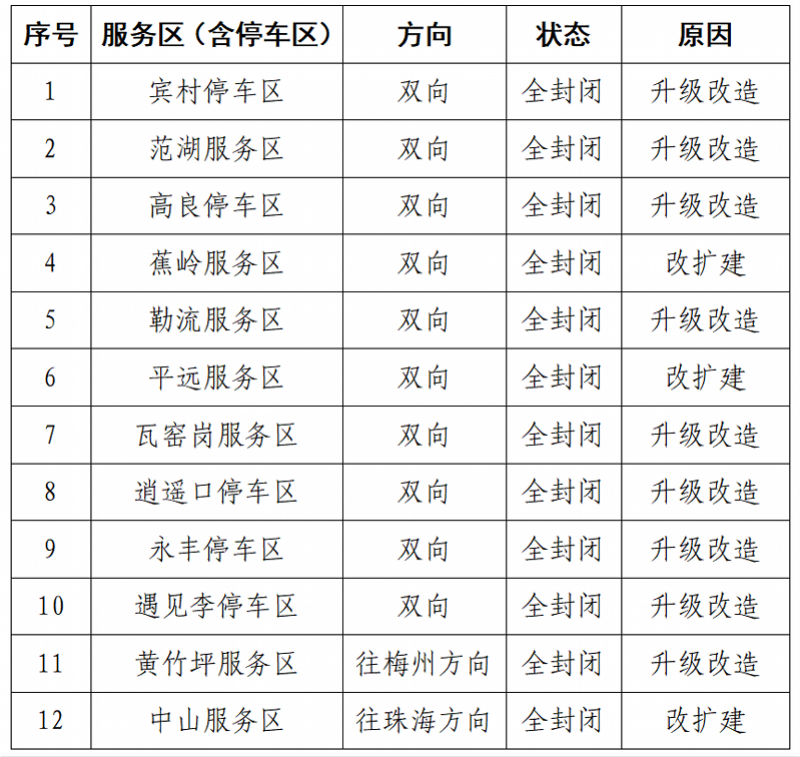 此外,宾村停车区、范湖服务区、高良停车区、蕉岭服务区、勒流服务区、平远服务区、瓦窑岗服务区、逍遥口停车区、永丰停车区、遇见李停车区、黄竹坪服务区、中山服务区等12个服务区(含停车区)封闭。
