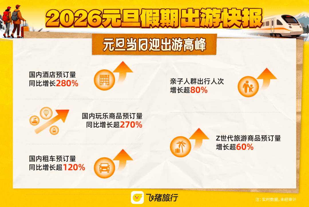 受“请3休8”拼假攻略的强力驱动,2026年元旦旅游市场火热开局。1月3日,飞猪发布的《2026元旦假期出游快报》显示,最热目的地南京排前十,消费者出游意愿与消费力双双提升,人均购买件数同比增长超20%、人均消费金额同比去年增长超30%。1月1日元旦当天配查信,国内酒店预订量同比去年劲增280%,国内目的地玩乐商品预订量同比增长超270%。
