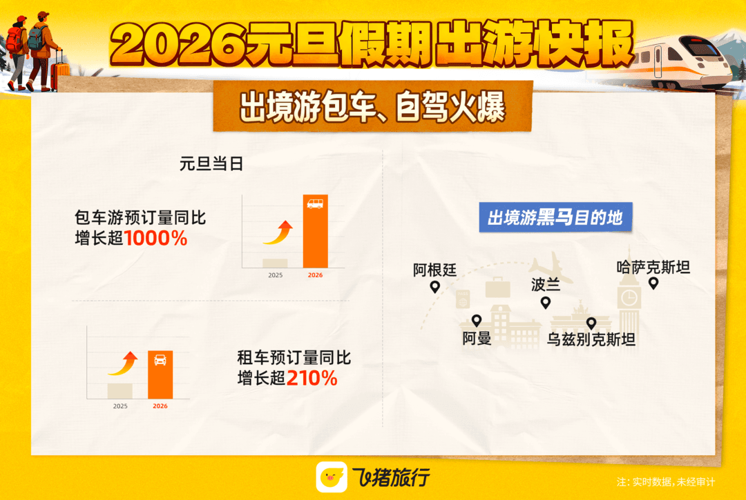 出境游方面,兼具自由度与舒适性的玩法热度高涨。飞猪数据显示,元旦当日,包车游预订量同比去年增长超10倍,租车预订量同比增长超210%。