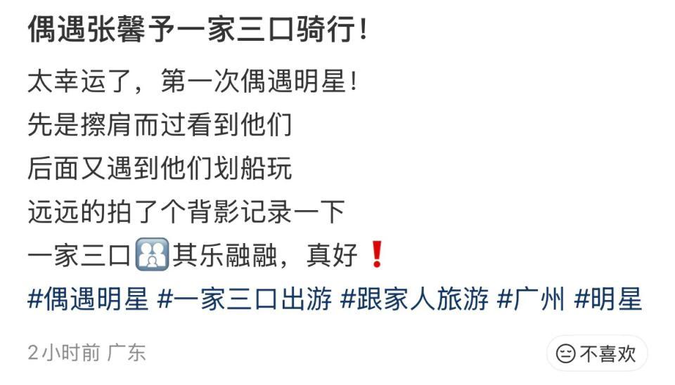 近日,有网友在社交平台晒照表示在广州偶遇张馨予一家三口骑行,后来还遇到他们一起划船,一家三口其乐融融,很是温馨有爱。